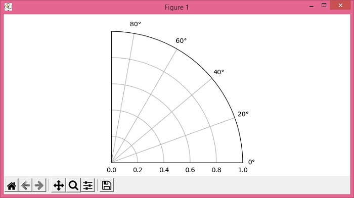 from matplotlib import pyplot as plt plt.rcParams["figure.figsize"] = [7.50, 3.50] plt.rcParams["figure.autolayout"] = True fig = plt.figure() ax = fig.add_subplot(111, projection="polar") max_theta = 90 ax.set_thetamax(max_theta) plt.show()