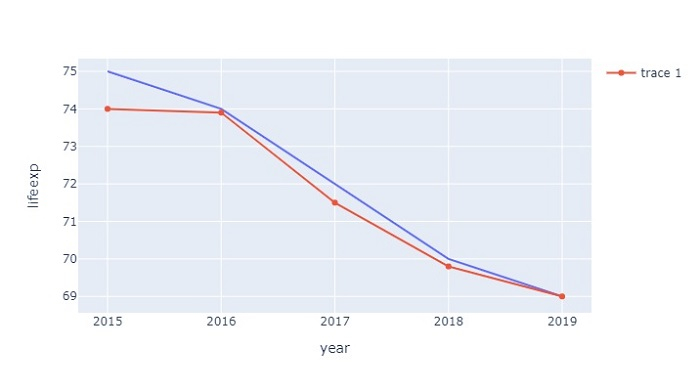 import plotly.express as px import pandas as pd # Create dataset data = { 'year':[2015,2016,2017,2018,2019], 'lifeexp':[75,74,72,70,69], 'state':['kerala','punjab','karnataka','andhra','odisha'], 'ratio':[74,73.9,71.5,69.8,69] } # Create dataframe df = pd.DataFrame(data) # Create Line plot fig = px.line(df, x=df['year'], y=df['lifeexp']) # Add Scatter plot fig.add_scatter(x=df['year'], y=df['ratio']) # Display the plot fig.show()