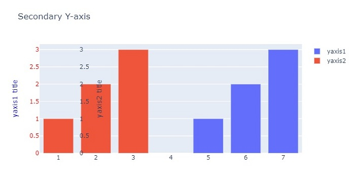 import plotly.graph_objects as go fig = go.Figure() fig.add_trace(go.Bar( x=[5, 6, 7], y=[1, 2, 3], name="yaxis1", yaxis='y1')) fig.add_trace(go.Bar( x=[1, 2, 3], y=[1, 2, 3], name="yaxis2", yaxis="y2")) # Create axis objects fig.update_layout( xaxis=dict(domain=[0.15, 0.15]), # create first y axis yaxis=dict( title="yaxis1 title", titlefont=dict(color="blue"), tickfont=dict(color="red") ), # Create second y axis yaxis2=dict( title="yaxis2 title", overlaying="y", side="right", position=0.15) ) fig.update_layout(title_text="Secondary Y-axis", width=716, height=400) fig.show()