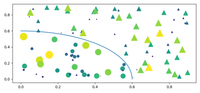 import matplotlib.pyplot as plt import numpy as np plt.rcParams["figure.figsize"] = [7.50, 3.50] plt.rcParams["figure.autolayout"] = True N = 100 r0 = 0.6 x = 0.9 * np.random.rand(N) y = 0.9 * np.random.rand(N) area = (20 * np.random.rand(N))**2 c = np.sqrt(area) r = np.sqrt(x ** 2 + y ** 2) area1 = np.ma.masked_where(r < r0, area) area2 = np.ma.masked_where(r >= r0, area) plt.scatter(x, y, s=area1, marker='^', c=c) plt.scatter(x, y, s=area2, marker='o', c=c) theta = np.arange(0, np.pi / 2, 0.01) plt.plot(r0 * np.cos(theta), r0 * np.sin(theta)) plt.show()