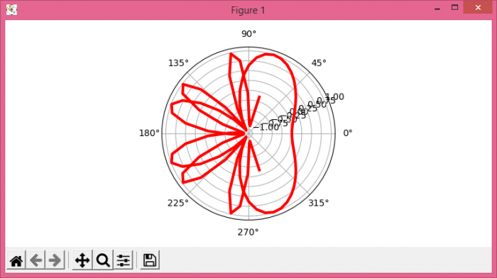 import numpy as np import matplotlib.pyplot as plt plt.rcParams["figure.figsize"] = [7.50, 3.50] plt.rcParams["figure.autolayout"] = True fig = plt.figure() ax = fig.add_subplot(projection='polar') x = np.linspace(-5, 5, 100) y = np.sin(x**2) ax.plot(x, y, color='red', lw=3) plt.show()