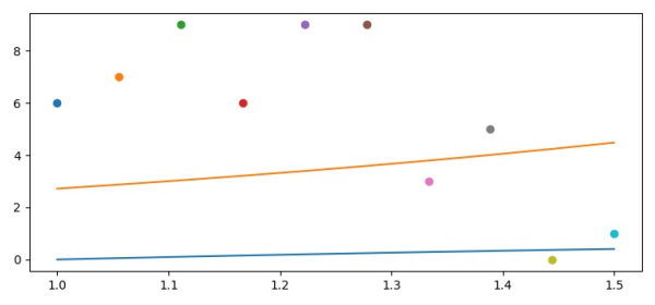 import numpy as np from matplotlib import pyplot as plt plt.rcParams["figure.figsize"] = [7.50, 3.50] plt.rcParams["figure.autolayout"] = True xpoints = np.linspace(1, 1.5, 10) y1points = np.log(xpoints) y2points = np.exp(xpoints) plt.plot(xpoints, y1points) plt.plot(xpoints, y2points) for i in xpoints: plt.scatter(i, np.random.randint(10)) plt.show()
