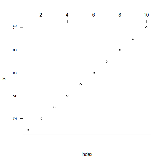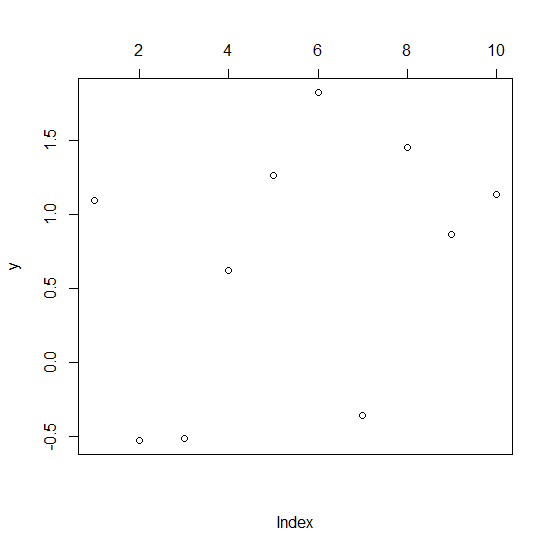 y<−rnorm(10,1,0.8) plot(y,xaxt="n");axis(3)