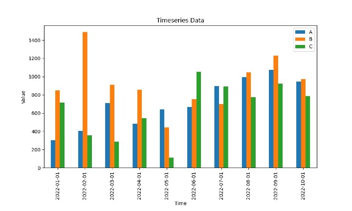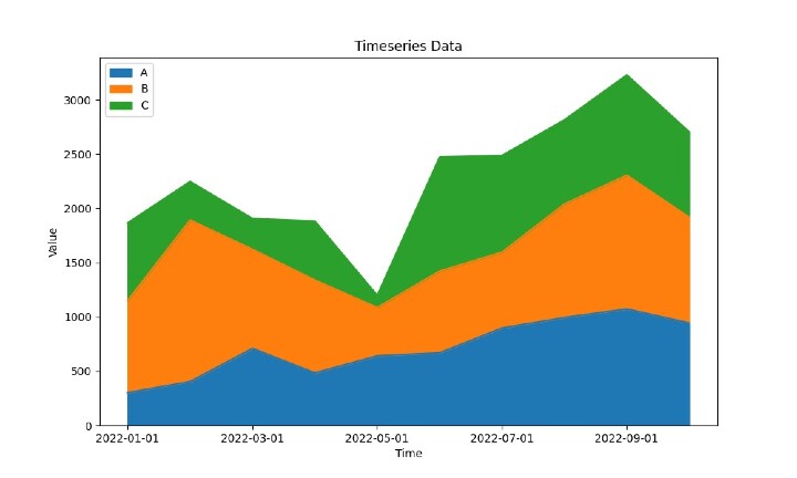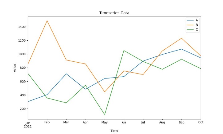 A B C Date 2022-01-01 302 849 715 2022-02-01 404 1488 355 2022-03-01 710 912 284 2022-04-01 484 855 543 2022-05-01 641 445 112 2022-06-01 669 752 1052 2022-07-01 897 699 891 2022-08-01 994 1045 776 2022-09-01 1073 1232 924 2022-10-01 944 974 786