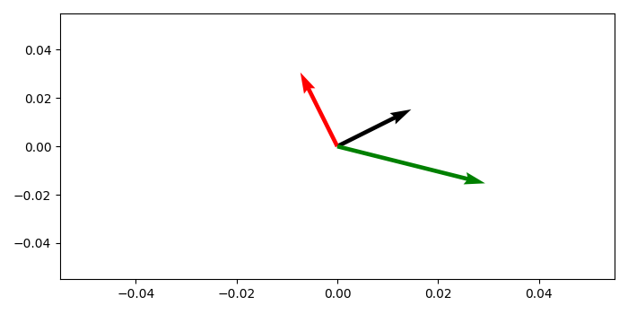 import numpy as np from matplotlib import pyplot as plt plt.rcParams["figure.figsize"] = [7.00, 3.50] plt.rcParams["figure.autolayout"] = True data = np.array([[2, 1], [-1, 2], [4, -1]]) origin = np.array([[0, 0, 0], [0, 0, 0]]) plt.quiver(*origin, data[:, 0], data[:, 1], color=['black', 'red', 'green'], scale=15) plt.show()