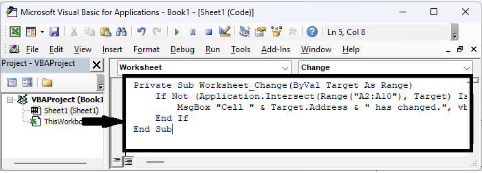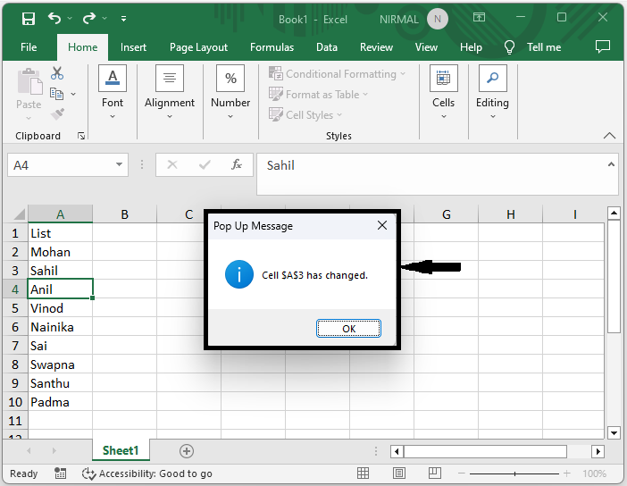 然後使用 Alt + Q 關閉 VBA。從現在開始,當指定範圍內的值發生更改時,將顯示一條訊息。