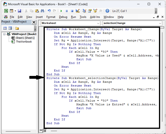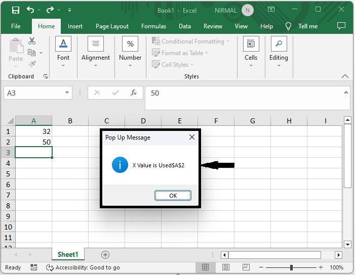 MsgBox "X Value is Entred" & xCell.Address, vbInformation, "Pop Up Message"