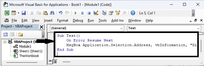 Sub Test() On Error Resume Next MsgBox Application.Selection.Address, vbInformation, "Display Range Cells" End Sub