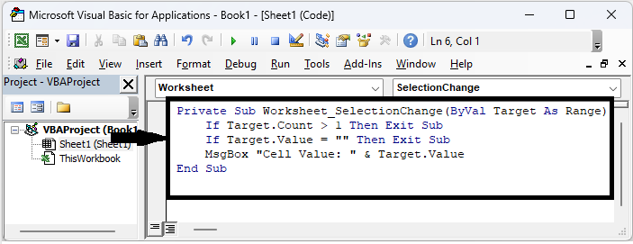 在這裡,我們將 VBA 程式碼插入到工作表中以完成任務。讓我們來看一個簡單的過程,瞭解如何在 Excel 中點選時彈出單元格值。