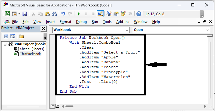 在這裡,我們將 VBA 程式碼新增到工作簿中以完成任務。讓我們來看一個簡單的過程,瞭解如何在 Excel 工作表開啟時使用指定資料填充組合框。