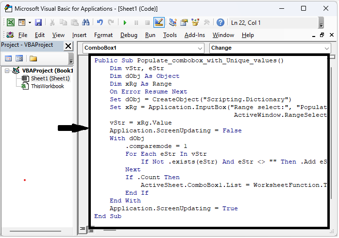 ActiveSheet.ComboBox1.List = WorksheetFunction.Transpose(.keys)