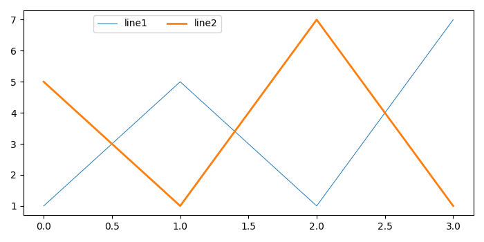 from matplotlib import pyplot as plt plt.rcParams["figure.figsize"] = [7.00, 3.50] plt.rcParams["figure.autolayout"] = True line1, = plt.plot([1, 5, 1, 7], linewidth=0.7) line2, = plt.plot([5, 1, 7, 1], linewidth=2.0) plt.legend([line1, line2], ["line1", "line2"], bbox_to_anchor=(0.45, 1.0), ncol=2) plt.show()