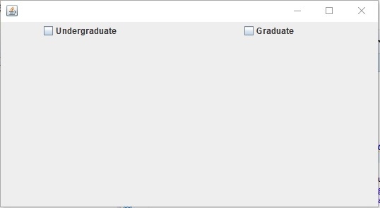 package my; import java.awt.GridBagConstraints; import java.awt.GridBagLayout; import java.awt.Insets; import javax.swing.JCheckBox; import javax.swing.JFrame; import javax.swing.JPanel; public class SwingDemo { public static void main(String[] args) { JFrame frame = new JFrame(); frame.setDefaultCloseOperation(frame.EXIT_ON_CLOSE); frame.setSize(500, 500); JPanel panel1 = new JPanel(new GridBagLayout()); JCheckBox checkBox1 = new JCheckBox("Undergraduate"); JCheckBox checkBox2 = new JCheckBox("Graduate"); panel1.add(checkBox1, new GridBagConstraints(0, 0, 1, 1, 1.0, 1.0, GridBagConstraints.NORTH, GridBagConstraints.NORTH, new Insets(0, 0, 0, 0), 0, 0)); panel1.add(checkBox2, new GridBagConstraints(1, 0, 1, 1, 2.0, 0.0, GridBagConstraints.NORTH, GridBagConstraints.NORTH, new Insets(0, 0, 0, 0), 0, 0)); frame.add(panel1); frame.setVisible(true); } }