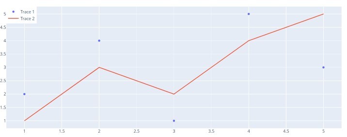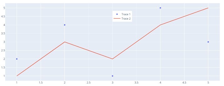import plotly.graph_objects as go # Test information x_values = [1, 2, 3, 4, 5] y_values1 = [2, 4, 1, 5, 3] y_values2 = [1, 3, 2, 4, 5] # Create traces trace1 = go.Scatter(x=x_values, y=y_values1, name='Trace 1', mode='markers') trace2 = go.Scatter(x=x_values, y=y_values2, name='Trace 2', mode='lines') # Create the figure fig = go.Figure([trace1, trace2]) # Update the design to put the legend inside the plot fig.update_layout(legend=dict(x=0.5, y=0.9)) # Change x and y facilitates on a case-by-case basis # Show the plot fig.show()
