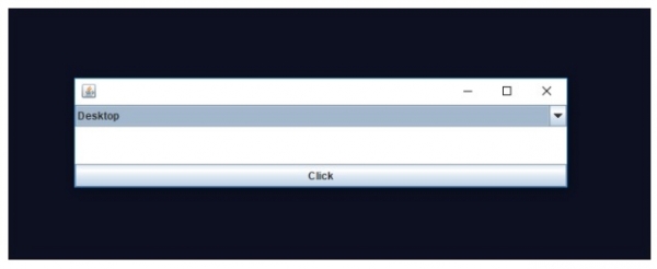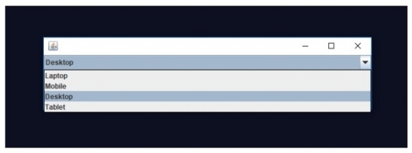 import java.awt.BorderLayout; import java.awt.event.ActionEvent; import java.awt.event.ActionListener; import javax.swing.JButton; import javax.swing.JComboBox; import javax.swing.JFrame; import javax.swing.JPanel; import javax.swing.JTextArea; public class SwingDemo { public static void main(String[] args) { JPanel panel = new JPanel(new BorderLayout()); String[] strArr = new String[] { "Laptop", "Mobile", "Desktop", "Tablet" }; JComboBox<String> comboBox = new JComboBox<>(strArr); panel.add(comboBox, BorderLayout.NORTH); JTextArea text = new JTextArea(5, 5); panel.add(text, BorderLayout.CENTER); JButton btn = new JButton("Click"); // selecting the index comboBox.setSelectedIndex(2); btn.addActionListener(new ActionListener() { @Override public void actionPerformed(ActionEvent e) { text.setText((String) comboBox.getSelectedItem()); comboBox.setSelectedIndex(0); } }); panel.add(btn, BorderLayout.SOUTH); JFrame frame = new JFrame(); frame.add(panel); frame.pack(); frame.setDefaultCloseOperation(JFrame.EXIT_ON_CLOSE); frame.setVisible(true); } }