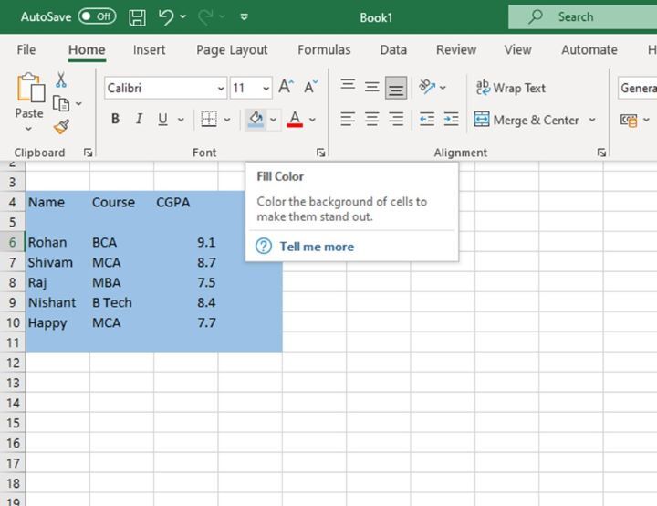 現在,在上圖中,我們可以看到我們沒有使用任何填充顏色選項。現在要執行此方法,步驟如下: