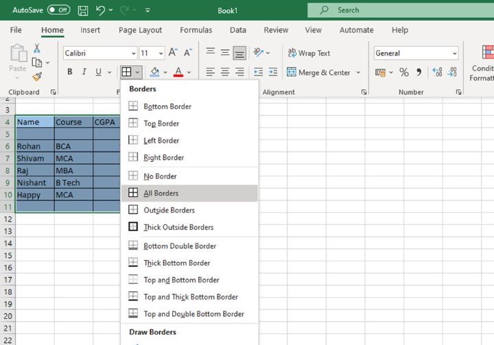 然後轉到“開始”。然後在字型部分,那裡有“邊框”下拉選單。