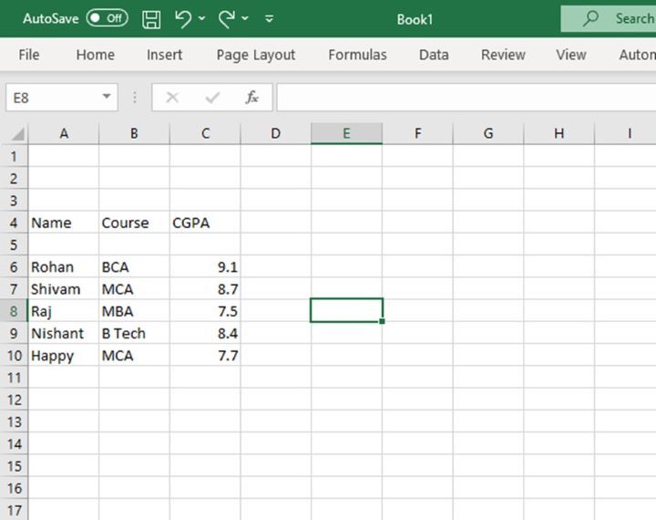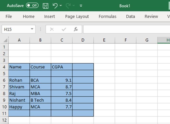 在本例中,我們在單元格範圍 A4:D11 中應用了填充顏色功能,我們可以看到在該範圍區域中,網格線消失了。這就是我們必須處理的問題。