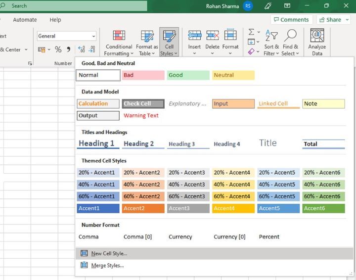 選擇開始。然後選擇樣式 -> 單元格樣式 -> 新建單元格樣式。