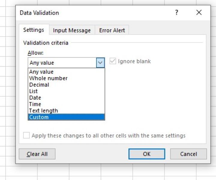 現在,在“設定”選項卡中,“允許”下拉選單中,選擇“自定義”選項。