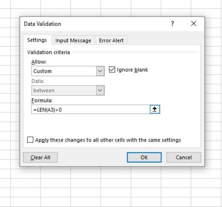 現在,在“公式”選項卡中,使用公式“**=LEN(A3)>0**”(這裡我們使用 A3 因為在我們的例子中這是我們的第一個單元格)。