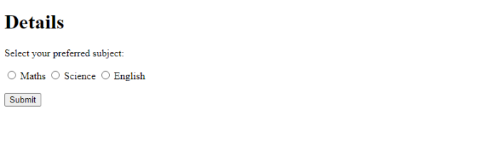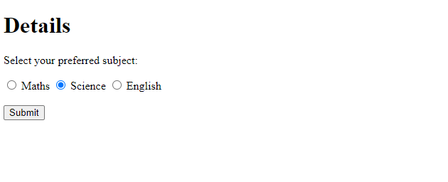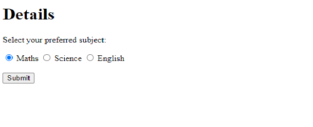 <!doctype html> <html lang="en"> <body> <h1>Details</h1> <form onsubmit="return false;"> <p>Select your preferred subject:</p> <div> <input type="radio" id="maths" name="subject" value="maths"> <label for="maths">Maths</label> <input type="radio" id="science" name="subject" value="science"> <label for="science">Science</label> <input type="radio" id="english" name="subject" value="english"> <label for="english">English</label> </div><br> <div> <button id="submit" type="submit">Submit</button> </div> </form> </body> </html>