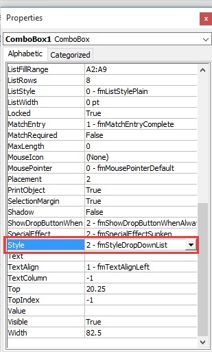 右鍵單擊組合框,然後單擊“屬性”。