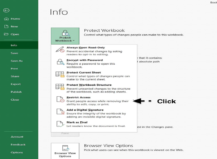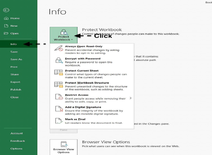 單擊“資訊”,然後從下拉選單中選擇“保護工作簿”。