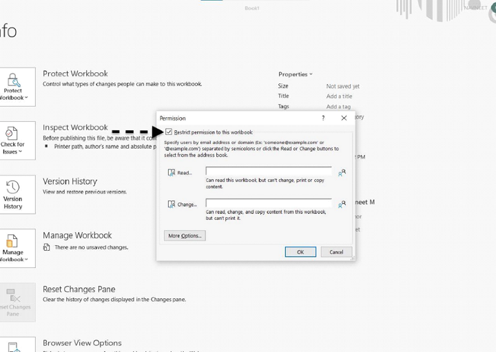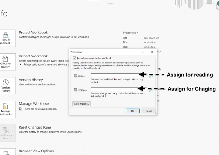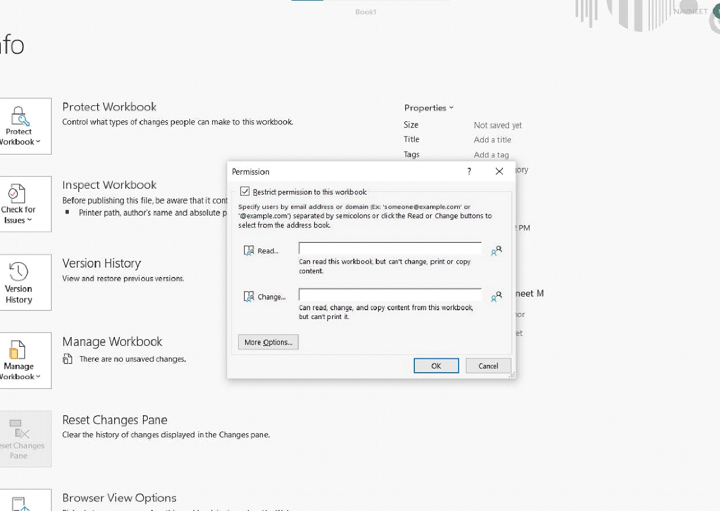 除了保護整個文件外,Excel 還允許您將訪問許可權限制為僅某些人或組織。修改使用者許可權可以限制多種操作,其中工作表新增只是其中之一。要控制使用者級別的訪問許可權,請執行以下操作。