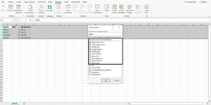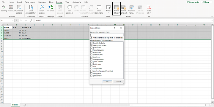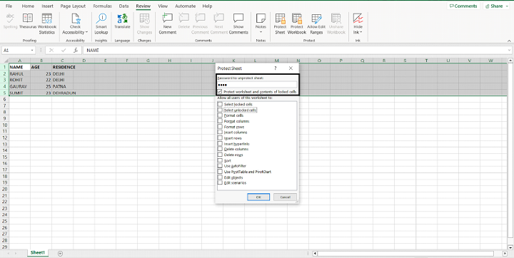 單擊“保護工作表”選項。將出現“保護工作表”對話方塊。
