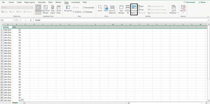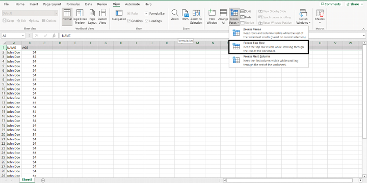 這樣做會固定工作表的頂行,這樣在向下瀏覽頁面時它就不會移動。這使得無論在列表中的任何位置,都可以輕鬆掃描頂行,無論是列標籤還是其他資料。