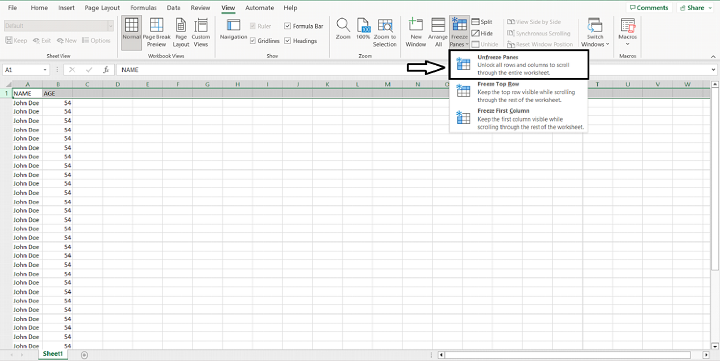要使用上述步驟凍結窗格後恢復正常滾動,只需使用“凍結窗格”選單中的“取消凍結窗格”選項重複這些步驟。