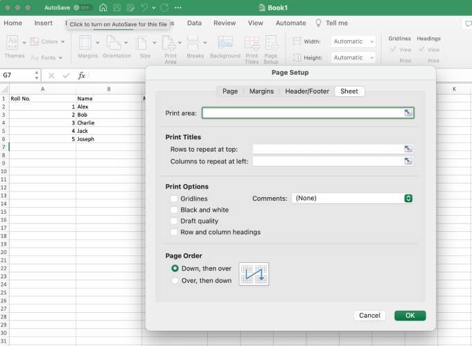 在“頁面設定”對話方塊中選擇“工作表”選項卡。您可以在此處更改僅與當前工作表相關的選項。