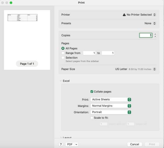在“列印”選單中,有一個複選框,您可以選擇啟用“網格線”。選擇此選項以列印您的頁面,以便在列印時可以看到網格線。在處理表格或大量資料時,網格線可能是可供使用的有效視覺工具。