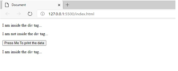 <!DOCTYPE html> <html lang="en"> <head> <meta charset="UTF-8"> <meta name="viewport" content="width=device-width, initial-scale=1.0"> <title>Document</title> </head> <link rel="stylesheet" href="//code.jquery.com/ui/1.12.1/themes/base/jquery-ui.css"> <script src="https://code.jquery.com/jquery-1.12.4.js"></script> <script src="https://code.jquery.com/ui/1.12.1/jquery-ui.js"></script> <link rel="stylesheet" href="https://cdnjs.cloudflare.com/ajax/libs/font-awesome/4.7.0/css/font-awesome.min.css"> <body> <div id='printThisDivIdOnButtonClick'> <p>I am inside the div tag...</p> </div> <p>I am not inside the div tag...</p> <input type='button' id='buttonId' value='Press Me To print the data'> <div id="printTheDivisionValue"></div> </body> <script> $('#buttonId').on('click', function () { displayTheData(); }) function displayTheData() { $(document).ready(function () { $("#printTheDivisionValue").html($("#printThisDivIdOnButtonClick").html()); }); } </script> </html>