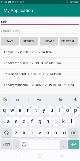 在上面的程式碼中,我們使用了名稱和薪水作為編輯文字,當用戶點選儲存按鈕時,它會將資料儲存到SQLite資料庫中。插入值後,點選重新整理按鈕以使用**特定日期資料**更新列表檢視。如果使用者點選更新按鈕,它將更新資料。