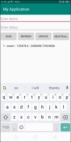 </LinearLayout>在上面的程式碼中,我們使用了姓名和工資作為EditText,當用戶點選儲存按鈕時,它會將資料儲存到SQLite資料庫中。點選重新整理按鈕以獲取列表檢視的更改。