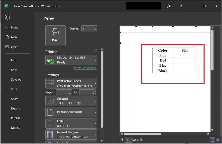 瞭解如何在不使用填充顏色的情況下列印工作表。請考慮以下給定的Excel表格。此Excel表格包含兩列。第一列是顏色,第二列是填充。在本例中,我們將確保包含多種顏色的列填充在傳遞列印命令時不會顯示顏色。這僅僅意味著該表應以黑白顏色顯示列印頁面佈局。