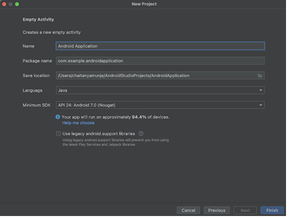 指定所有詳細資訊後,單擊“Finish”以建立一個新的Android Studio專案。