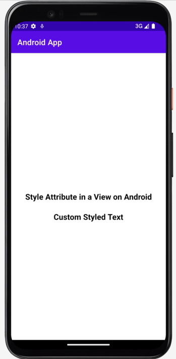 <?xml version="1.0" encoding="utf-8"?> <RelativeLayout xmlns:android="http://schemas.android.com/apk/res/android" xmlns:app="http://schemas.android.com/apk/res-auto" xmlns:tools="http://schemas.android.com/tools" android:layout_width="match_parent" android:layout_height="match_parent" tools:context=".MainActivity"> <!-- creating a text view on below line--> <TextView android:id="@+id/idTVHeading" android:layout_width="match_parent" android:layout_height="wrap_content" android:layout_centerInParent="true" android:layout_marginStart="20dp" android:layout_marginTop="20dp" android:layout_marginEnd="20dp" android:layout_marginBottom="20dp" android:padding="4dp" android:text="Style Attribute in a View on Android" android:textAlignment="center" android:textColor="@color/black" android:textSize="20sp" android:textStyle="bold" /> <!-- creating a text view to display custom styled text view--> <TextView android:id="@+id/idTVMessage" android:layout_width="wrap_content" android:layout_height="wrap_content" android:layout_below="@id/idTVHeading" android:layout_centerHorizontal="true" android:text="Custom Styled Text" /> </RelativeLayout>