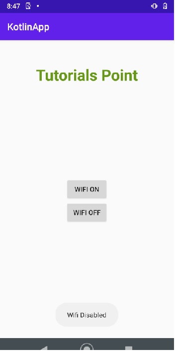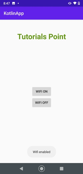 <?xml version="1.0" encoding="utf-8"?> <RelativeLayout xmlns:android="http://schemas.android.com/apk/res/android" xmlns:tools="http://schemas.android.com/tools" android:layout_width="match_parent" android:layout_height="match_parent" tools:context=".MainActivity"> <TextView android:layout_width="wrap_content" android:layout_height="wrap_content" android:layout_centerHorizontal="true" android:layout_marginTop="50dp" android:text="Tutorials Point" android:textAlignment="center" android:textColor="@android:color/holo_green_dark" android:textSize="32sp" android:textStyle="bold" /> <Button android:id="@+id/button" android:layout_width="wrap_content" android:layout_height="wrap_content" android:layout_centerInParent="true" android:onClick="enableWifi" android:text="Wifi On!" /> <Button android:layout_width="wrap_content" android:layout_height="wrap_content" android:layout_below="@id/button" android:layout_centerInParent="true" android:onClick="disableWifi" android:text="Wifi Off!" /> </RelativeLayout>