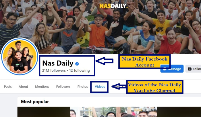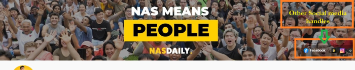 NasDaily 在其 YouTube 頻道的橫幅上展示了其所有社交媒體,並且還在 Facebook 上推廣其影片。