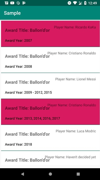 <?xml version="1.0" encoding="utf-8"?> <RelativeLayout xmlns:android="http://schemas.android.com/apk/res/android" android:id="@+id/container" android:layout_width="match_parent" android:layout_height="match_parent" android:background="@drawable/background_selector" android:padding="16dp"> <TextView android:id="@+id/awardTitle" android:layout_width="wrap_content" android:layout_height="wrap_content" android:layout_marginTop="10dp" android:text="New Text" android:textSize="18sp" android:textStyle="bold" /> <TextView android:id="@+id/awardYear" android:layout_width="wrap_content" android:layout_height="wrap_content" android:layout_below="@+id/awardTitle" android:layout_alignStart="@+id/awardTitle" android:layout_marginTop="20dp" android:text="New Text" android:textColor="#000" /> <TextView android:id="@+id/playerName" android:layout_width="wrap_content" android:layout_height="wrap_content" android:layout_alignParentEnd="true" android:text="New Text" /> </RelativeLayout>