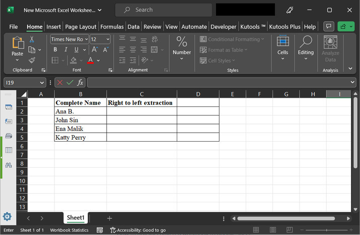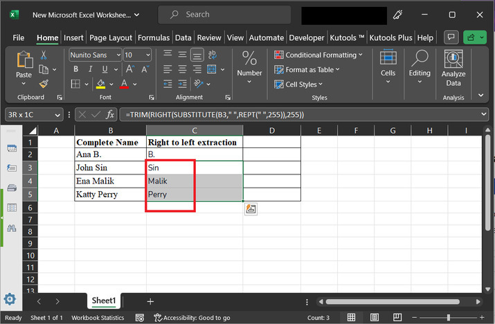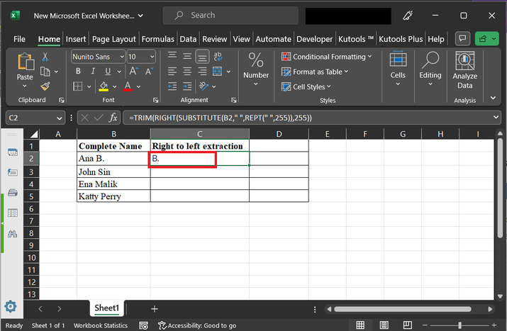有時,在 Excel 中,使用者希望為提供的任務提取資料,提取將從右到左進行。例如,如果一個單元格包含資料“Ana Ban”,則提取的字串將為“Ban”。為了演示用於完成此任務的公式,我們將提供一個簡單的示例。所有解釋都以詳細的分步方式進行指導。第一個示例指導使用公式執行相同任務的過程。