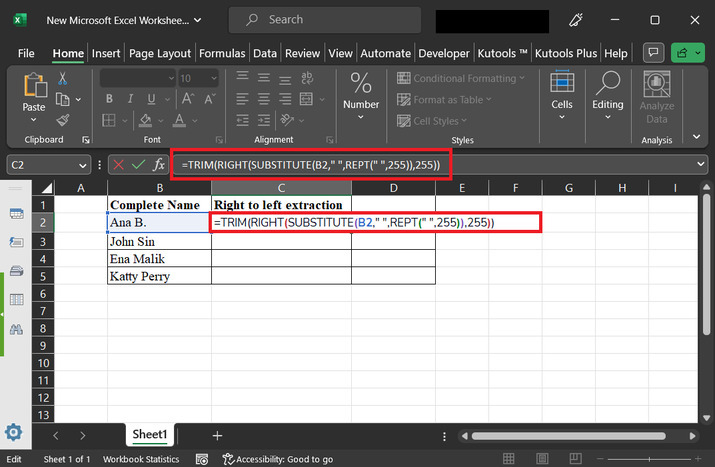 轉到 C2 單元格,並鍵入公式“=TRIM(RIGHT(SUBSTITUTE(B2," ",REPT(" ",255)),255))”。請參考下圖。