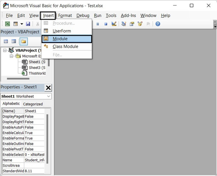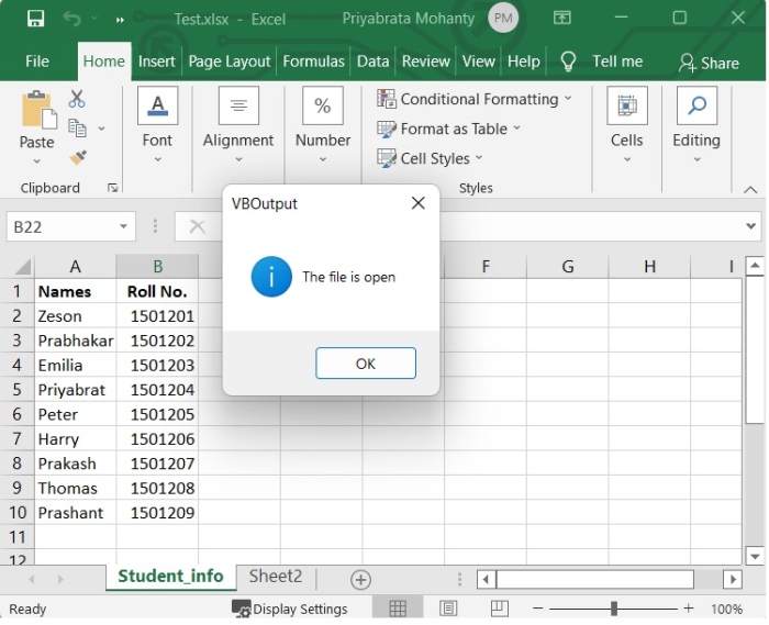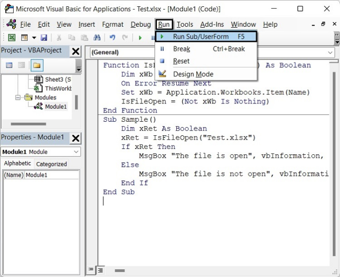 在上面的程式碼中,**Test.xlsx** 是我們要檢查(是否已開啟或關閉)的工作簿的名稱。