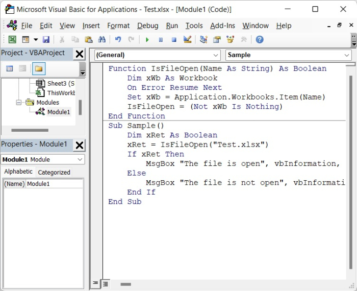Sub Sample() Dim xRet As Boolean xRet = IsFileOpen("Test.xlsx") If xRet Then MsgBox "The file is open", vbInformation, "VBOutput" Else MsgBox "The file is not open", vbInformation, "VBOutput" End If End Sub