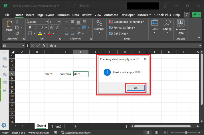 執行程式碼後,將顯示標題為“檢查工作表是否為空?”的對話方塊,顯示的訊息表明工作表不為空。這僅僅意味著工作表包含一些有效資料。之後,單擊“確定”按鈕。