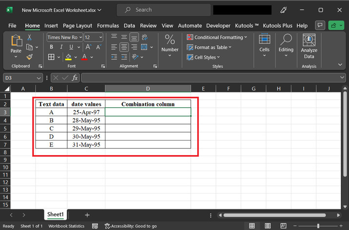 在本文中,使用者將學習將文字和日期合併到同一個單元格的過程。這裡,第一列包含文字,第二列包含相應的日期,最後一列用於儲存結果。