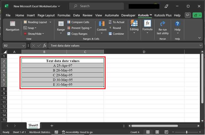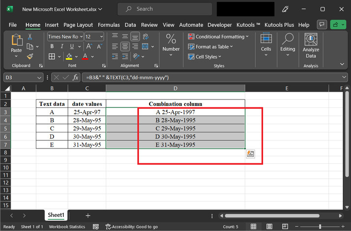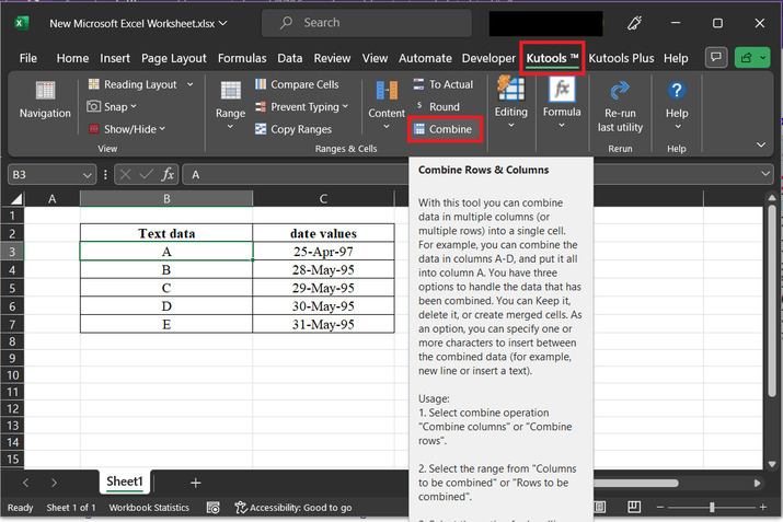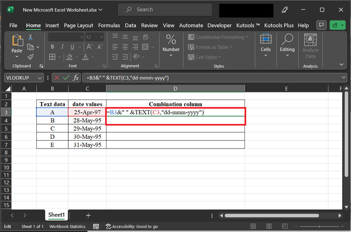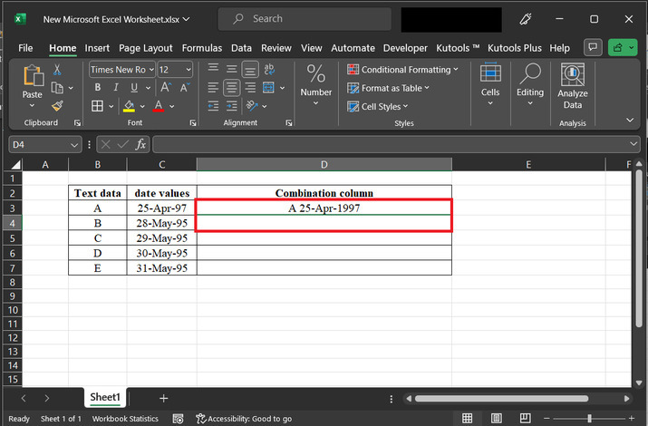 示例 2:使用 Excel 中的 kutools 將文字和日期合併到同一個單元格中。